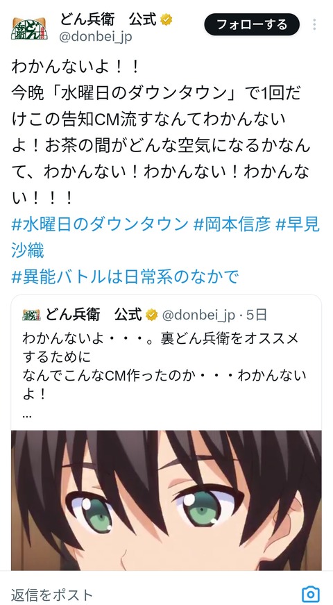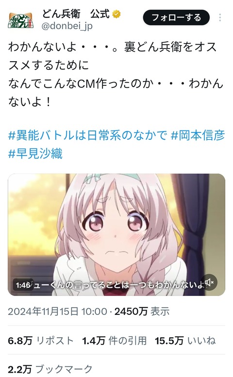 なんでこんなCM作ったのか・・・わかんないよ!#異能バトルは日常系のなかで #岡本信彦 #早見沙織 pic.twitter.com/KQqzDrPDqz