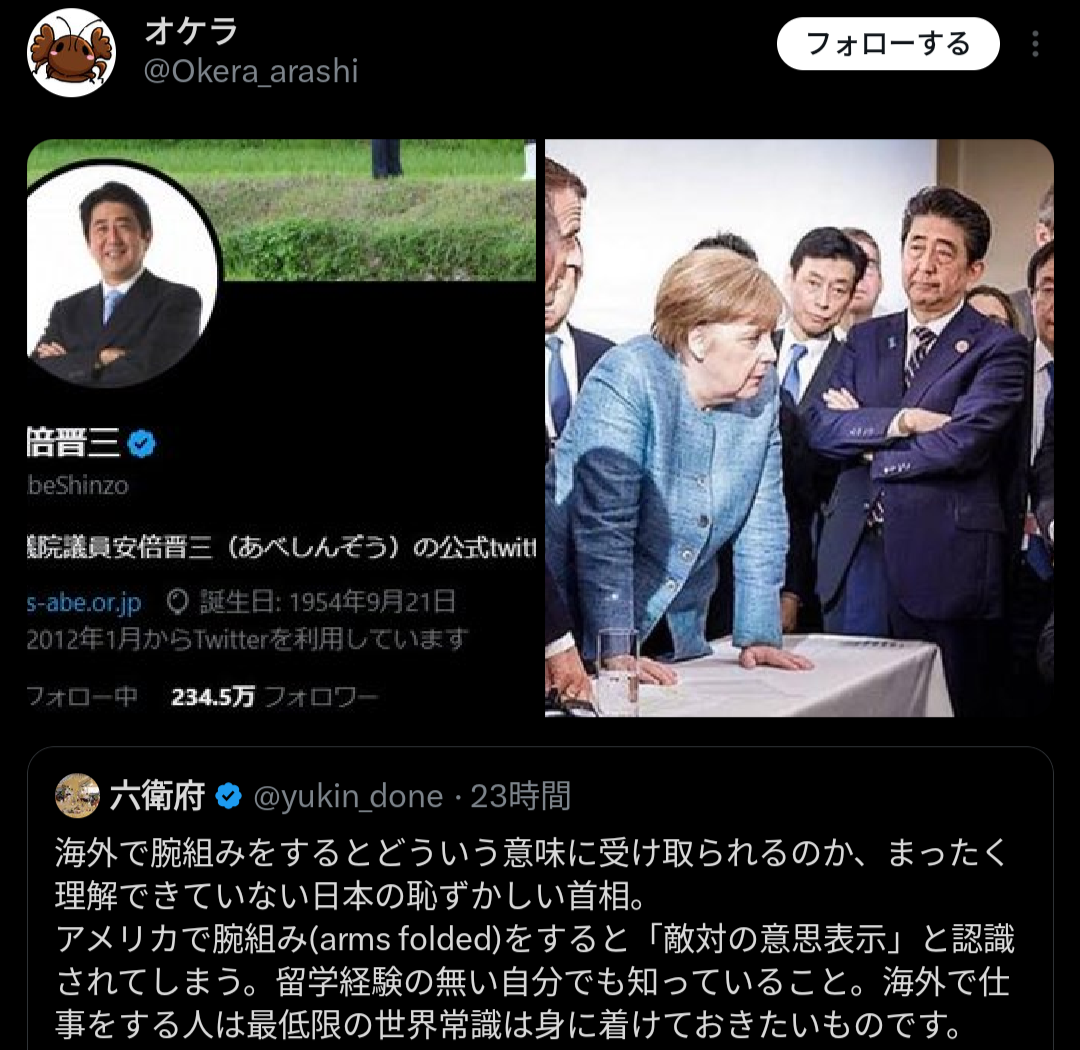 【悲報】安倍晋三の腕組み画像が大炎上中wwwwwwwwww Twitter Facebook はてブ LINE コピー 2024.11.21 スポンサーリンク 1:それでも動く名無し:2024/11/20(水) 12:28:50.33 ID:ufayGAUD0HAPPY.net 2:それでも動く名無し:2024/11/20(水) 12:29:50.47 ID:Zz4mKNyX0HAPPY.net 安倍さんどうして 3:それでも動く名無し:2024/11/20(水) 12:30:23.04 ID:ZRG4Y+lS0HAPPY.net 死んでも燃える男 煉獄かな 続きを読む