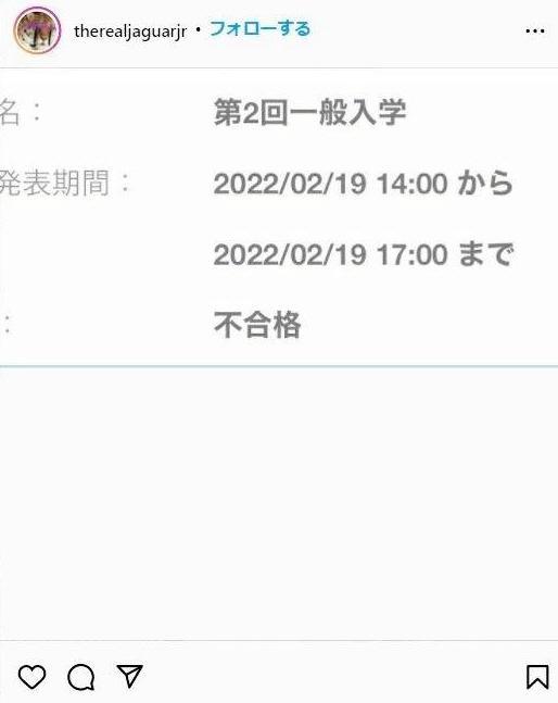 ジャガー横田と医師・木下博勝氏の長男で、YouTuberとしても活動する「JJ」こと大維志君(15)が15日、インスタグラムを更新。高校入試に不合格だったことを報告した。