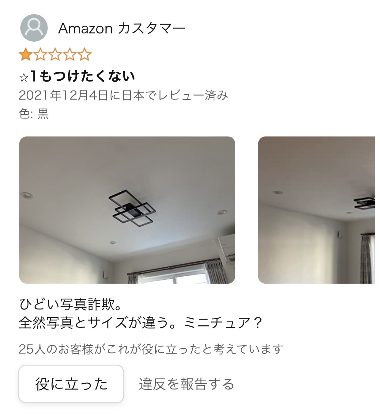「amazonでかっこいいシーリングライト買った!」→ひどい写真詐欺 ⭐︎1もつけたくない Twitter Facebook はてブ LINE コピー 2022.03.15 スポンサーリンク 1: 風吹けば名無し 2022/03/15(火) 21:15:22.08 ID:uzsBrJFjr 理想 現実 9: 風吹けば名無し 2022/03/15(火) 21:17:02.32 ID:7EmcCAqy0 ※写真はイメージです 10: 風吹けば名無し 2022/03/15(火) 21:17:49.10 ID:bZcvRKA90 サイズ書いてあるやろふつう 続きを読む