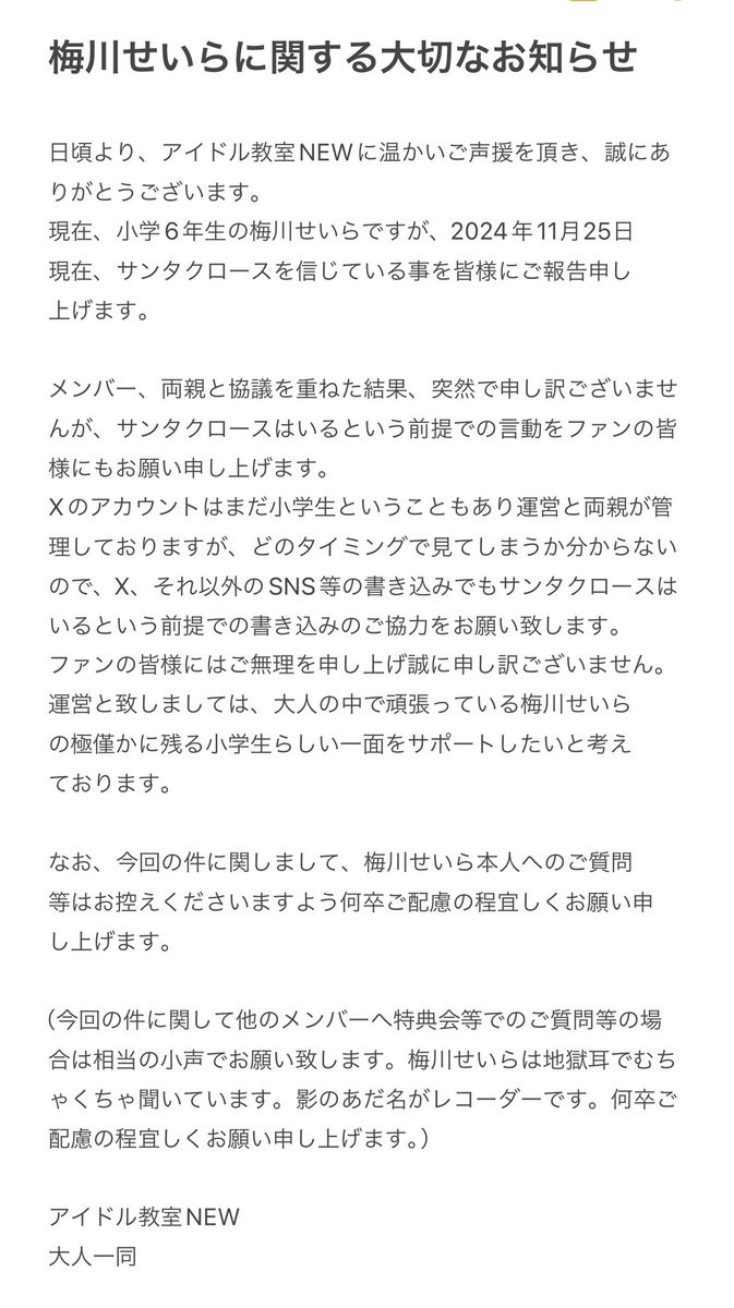 アイドル運営さん、サンタクロースを信じている小学生メンバーへの配慮を求めるwwwwwwwwww Twitter Facebook はてブ LINE コピー 2024.11.25 スポンサーリンク 1:それでも動く名無し ハンター[Lv.44][木] (5段):2024/11/25(月) 15:31:31.02 ID:Tz7AKGE70 VIPQ2_EXTDAT: checked:checked:1000:512:donguri=0/4: EXT was configured 2:それでも動く名無し:2024/11/25(月) 15:32:47.13 ID:WpE3/4Zn0 陰口開示? 続きを読む