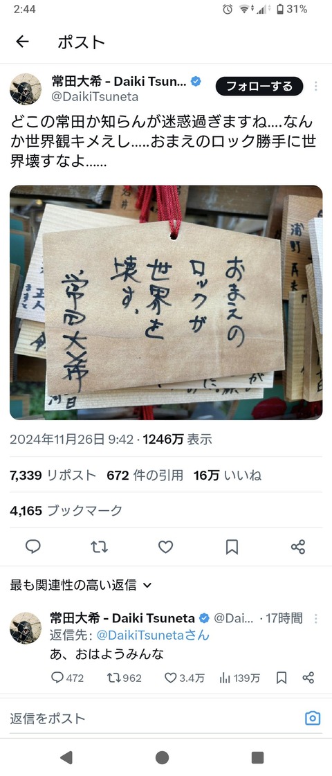 King Gnuの常田大希、同姓同名の絵馬を罵ってしまうwww (※画像あり) Twitter Facebook はてブ LINE コピー 2024.11.27 スポンサーリンク 1:それでも動く名無し 警備員[Lv.38]:2024/11/27(水) 02:47:58.95 ID:VBXwqZeE0 2: 警備員[Lv.6][新芽]:2024/11/27(水) 02:48:49.77 ID:9S/9po0B0 この人痛くない? 3:それでも動く名無し 警備員[Lv.8][新芽]:2024/11/27(水) 02:56:06.17 ID:cqMalmPp0 >>2 ロックやね 4:それでも動く名無し 警備員[Lv.42][苗]:2024/11/27(水) 03:00:21.26 ID:aldN1CCi0 余裕ないんかこの人 続きを読む