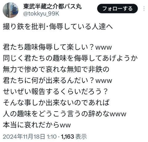 【画像】撮り鉄さん、批判してる奴に対して顔真っ赤ツイートをしてしまうwwwwwwwww Twitter Facebook はてブ LINE コピー 2024.11.29 スポンサーリンク 1:それでも動く名無し ハンター[Lv.69][SSR武][SSR防+10][木]:2024/11/28(木) 22:10:09.88 ID:koL+E4dN0 ここまでムキにならなくてもいいのに 2:それでも動く名無し 警備員[Lv.31][苗]:2024/11/28(木) 22:10:53.15 ID:vvLw3zIg0 頭シュポシュポで草 3:それでも動く名無し 警備員[Lv.24]:2024/11/28(木) 22:11:18.96 ID:E7/UyHLQ0 草生やす必要ないだろ 4:それでも動く名無し 警備員[Lv.8][新芽]:2024/11/28(木) 22:14:07.66 ID:VTcM2rGhd 非鉄っていうんや 続きを読む