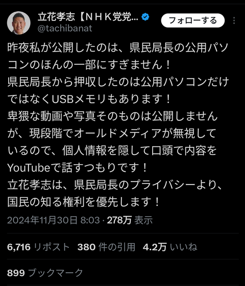 立花孝志「公開したのはごく一部です。オールドメディアが無視するので、Hなやつ以外は暴露します」 Twitter Facebook はてブ LINE コピー 2024.12.01 スポンサーリンク 1:それでも動く名無し 警備員[Lv.12][新芽]:2024/12/01(日) 10:07:47.00 ID:iUgLZj4U0 ヤバすぎるやろ 3:それでも動く名無し 警備員[Lv.7][芽]:2024/12/01(日) 10:08:17.84 ID:gEG71Nq00 t子さんは大丈夫なん? 続きを読む