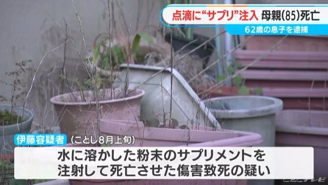 入院中の母親の点滴に“水に溶かした粉末サプリメント”を注入 血液に細菌入って母親死亡 62歳の息子を傷害致死の疑いで逮捕