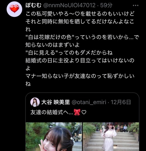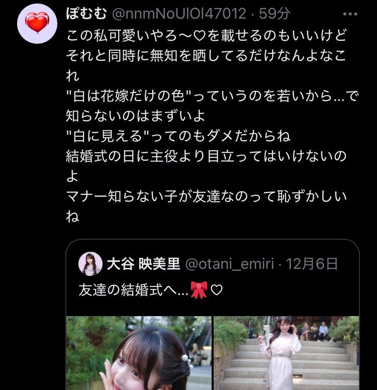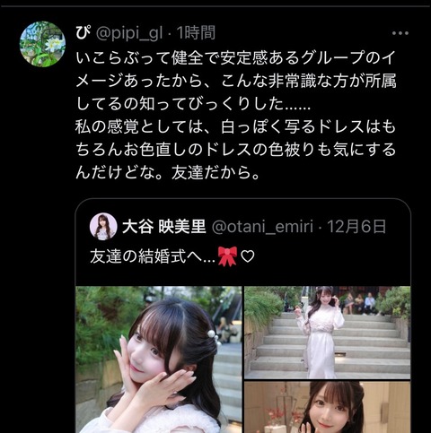 アイドルグループ「=LOVE」の大谷映美里(26)の結婚式参列コーデをめぐって、SNS上で論争が起こっている。