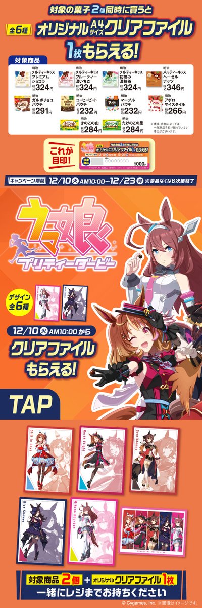12/10(火)朝10:00から『ウマ娘 プリティーダービー』キャンペーンスタート!#ファミリーマート で対象の明治のお菓子を買うとオリジナルクリアファイルをプレゼント!