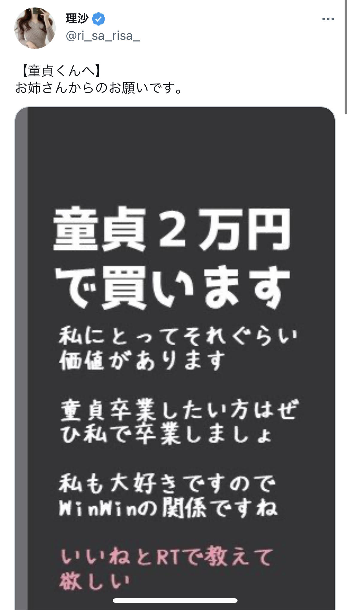【速報】ツイッター女さん「童貞2万で買います!」 童貞がワラワラ集まるwwwwwwwww Twitter Facebook はてブ LINE コピー 2024.12.13 スポンサーリンク 1:それでも動く名無し:2024/12/13(金) 15:04:05.44 ID:QRbvPF980 2:それでも動く名無し:2024/12/13(金) 15:07:16.85 ID:LW3qAums0 AI定期 3:それでも動く名無し:2024/12/13(金) 15:07:29.79 ID:7cc6C94Q0 闇バイトとかさせられそう 続きを読む