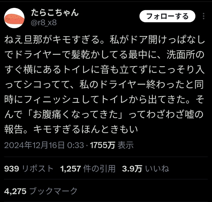 女さん「ねえ旦那がキモすぎる」←10万いいね wwwwww Twitter Facebook はてブ LINE コピー 2024.12.17 スポンサーリンク 1:それでも動く名無し:2024/12/17(火) 17:12:43.41 ID:RSteuXNt0 2:それでも動く名無し:2024/12/17(火) 17:13:00.09 ID:RSteuXNt0 夫婦なんやからええやろ… 3:それでも動く名無し:2024/12/17(火) 17:13:12.82 ID:RSteuXNt0 嫁でシコるのもあかんのか…? 60:それでも動く名無し:2024/12/17(火) 17:39:42.77 ID:I+G/MAIQd >>3 別に嫁でシコってるとは限らんやろ 続きを読む