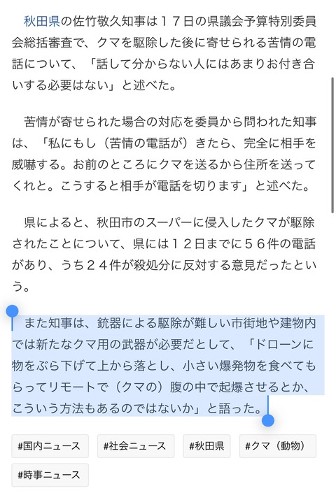 【悲報】秋田県知事「食べ物に爆弾仕掛けて、クマが食べたら腹の中で爆発させればいい」 Twitter Facebook はてブ LINE コピー 2024.12.18 スポンサーリンク 1:以下、?ちゃんねるからVIPがお送りします:2024/12/18(水) 12:23:15.926 ID:zM3/5ibZ0 流石にやりすぎやろ… 3:以下、?ちゃんねるからVIPがお送りします:2024/12/18(水) 12:24:29.500 ID:SrWQGVCsM 熊にどんだけ恨みあるんだよ 5:以下、?ちゃんねるからVIPがお送りします:2024/12/18(水) 12:25:01.335 ID:1lUduRVi0 愛誤煽っててわろ 続きを読む