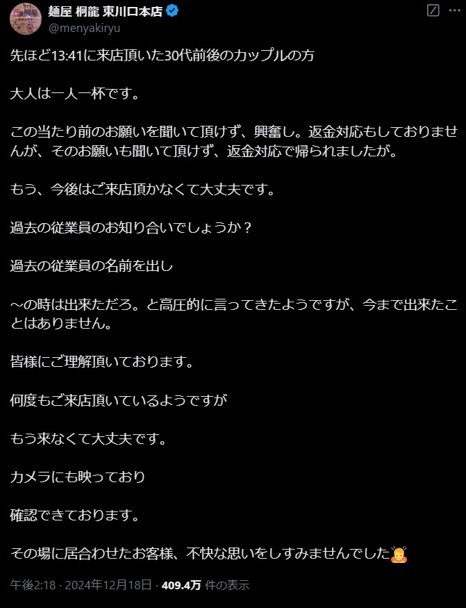【悲報】ラーメン屋「30代カップルが2人で1杯しか頼まなかったから出禁にした」 Twitter Facebook はてブ LINE コピー 2024.12.20 スポンサーリンク 1:それでも動く名無し:2024/12/19(木) 22:59:14.46 ID:UXNyvtNy0 2:それでも動く名無し:2024/12/19(木) 22:59:37.73 ID:UXNyvtNy0 世知辛い世の中やな… 3:それでも動く名無し:2024/12/19(木) 23:00:33.33 ID:TZtCit2N 実際目の前でやられたら嫌だと思う 4:それでも動く名無し:2024/12/19(木) 23:01:03.11 ID:vDgx1thx0 ラーメン屋って何でこんな偉そうなんやろな すぐxでお気持ち表明するし 続きを読む