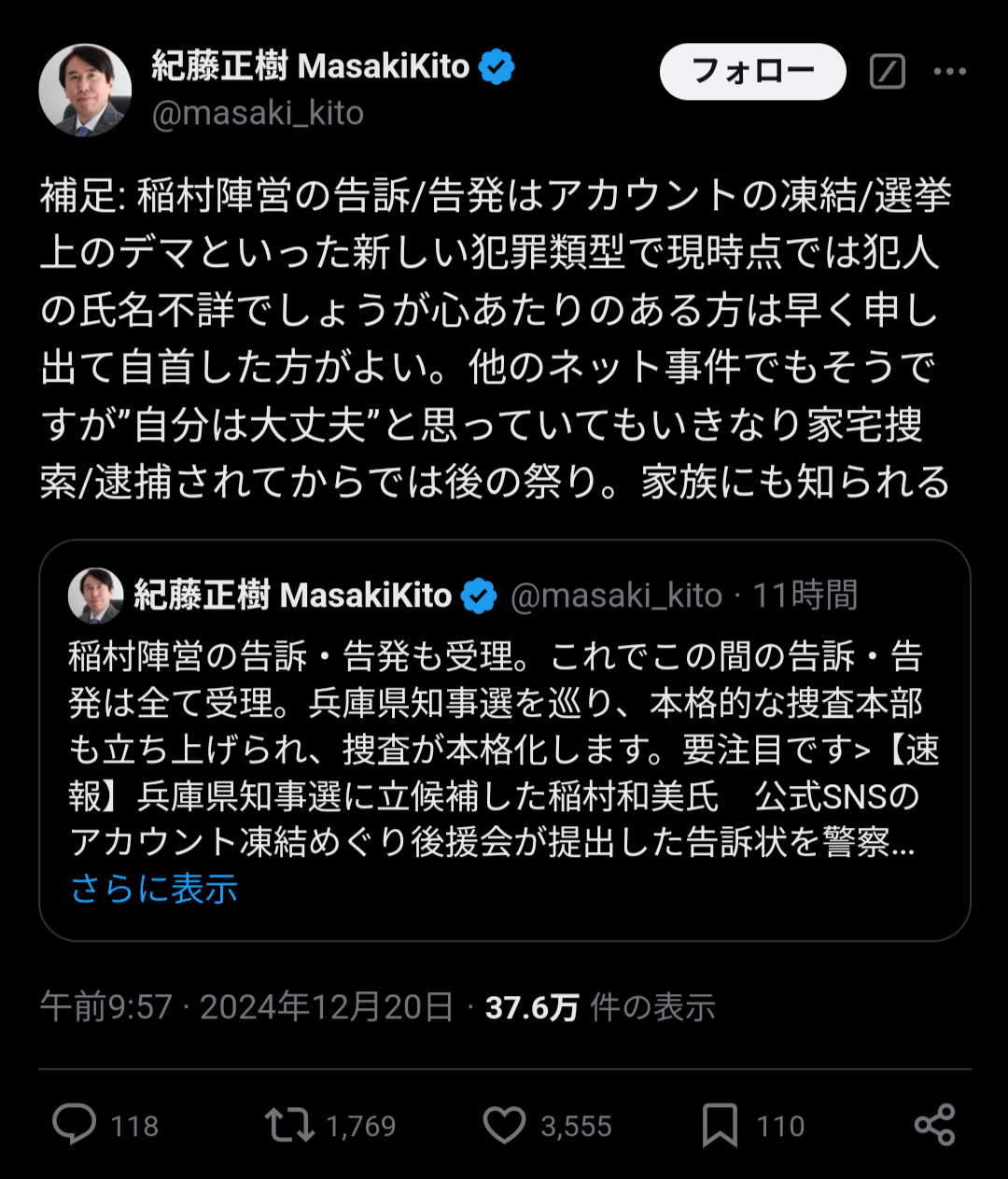 紀藤弁護士「兵庫県知事選でデマを流してた人達は自首した方が良い。今ならまだ間に合う」 Twitter Facebook はてブ LINE コピー 2024.12.21 スポンサーリンク 1:それでも動く名無し:2024/12/20(金) 20:58:16.73 ID:WDfav19d0 正義の弁護士の助言 3:それでも動く名無し:2024/12/20(金) 21:00:50.17 ID:vfUDr+BE0 統一キラー 4:それでも動く名無し:2024/12/20(金) 21:01:13.03 ID:R3lIzMM90 自首しなくても同じだろ 6:それでも動く名無し:2024/12/20(金) 21:03:31.36 ID:vHbye9aod もう間に合わんやろ 受理されてもうたやろ 続きを読む