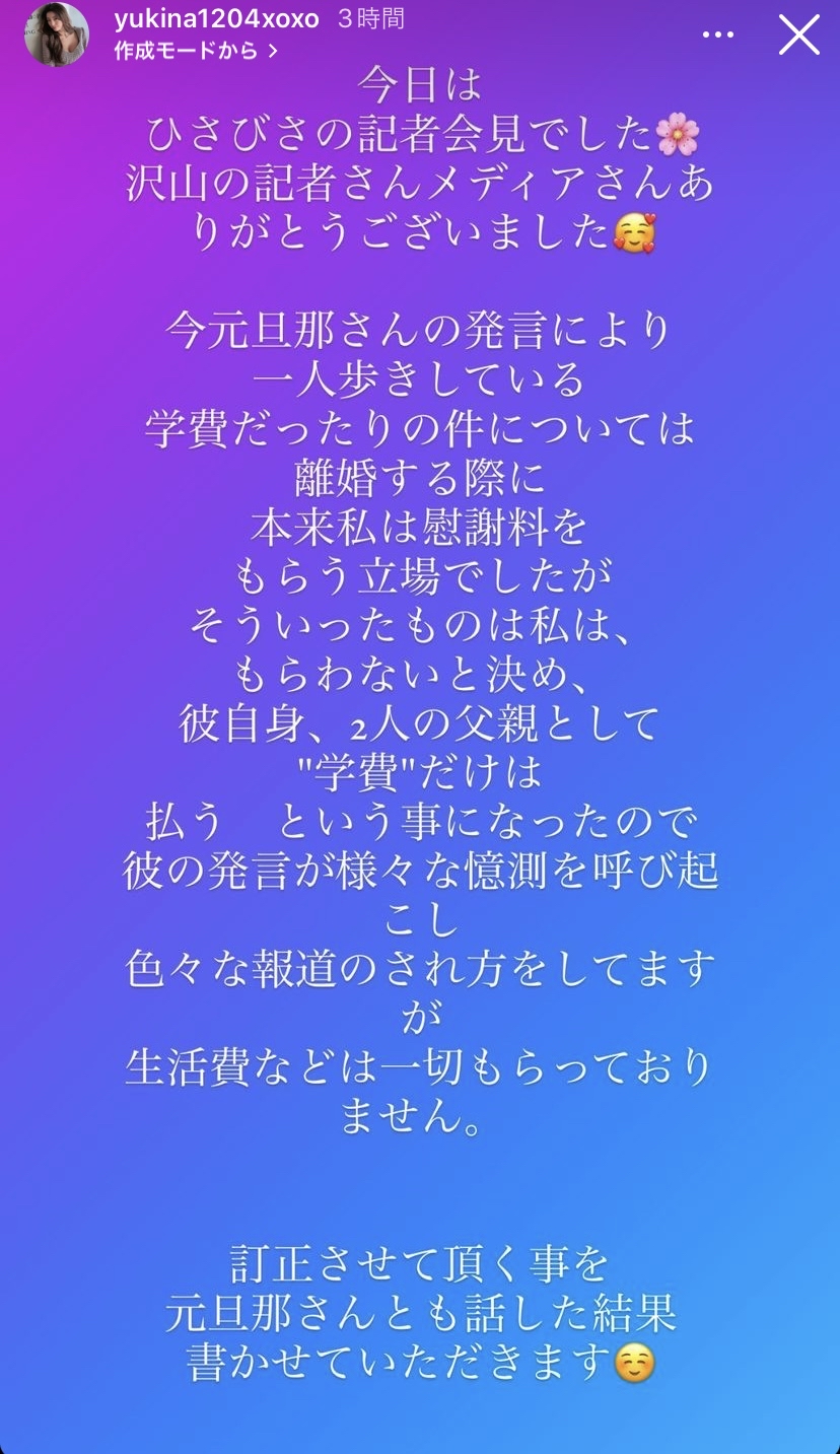 「離婚する際に本来私は慰謝料をもらう立場でしたが」と気になる記述の後、「そういったものは私は、もらわないと決め、彼自身、2人の父親として“学費”だけは払う という事になったので 彼の発言が様々に憶測を呼び起こし 色々な報道のされ方をしてますが 生活費などは一切もらっておりません」と説明。