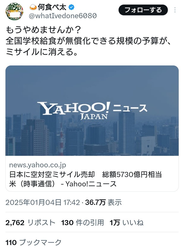 【悲報】日本さん、全国の給食を無償化できるお金をミサイルに注ぎ込んでしまうwwwwwwwww Twitter Facebook はてブ LINE コピー 2025.01.06 スポンサーリンク 1 : 以下、?ちゃんねるからVIPがお送りします :2025/01/05(日) 22:21:03 ID:eqLSLx4P0.netありがとう自民党もうやめませんか?全国学校給食が無償化できる規模の予算が、ミサイルに消える。https://t.co/pqE3fCgv4I— 🍛何食べ太 (@whatIvedone6080) January 4, 2025転載元スレッド:https://viper.2ch.sc/test/read.cgi/news4vip/1736083263/ 続きを読む