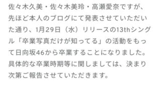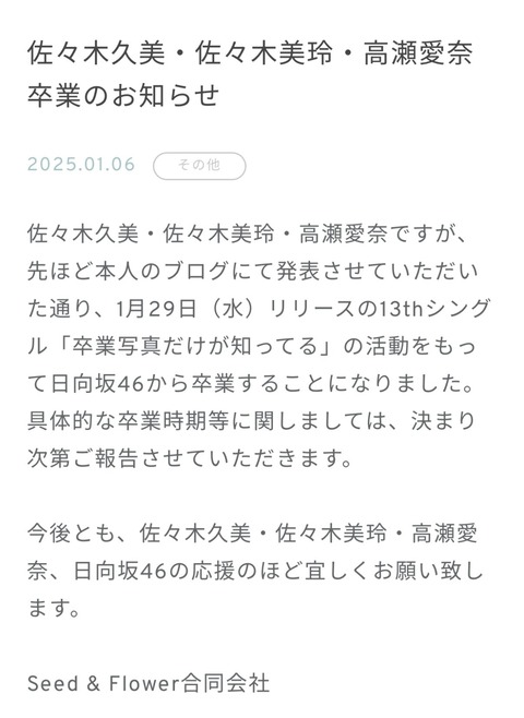 日向坂46の佐々木久美(28)佐々木美玲(25)高瀬愛奈(26)が6日、それぞれの公式ブログを更新し、グループからの卒業を発表した。1月29日発売の13枚目シングル「卒業写真だけが知ってる」の活動をもって卒業する。長年グループを支えてきた一期生全員が日向坂46を去ることとなった。