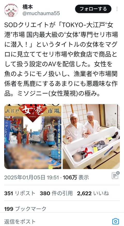 【画像】フェミニスト女さんがSODの新作AVにブチギレ、頑張って翻訳して海外にも発信中wwwwwwww Twitter Facebook はてブ LINE コピー 2025.01.07 スポンサーリンク 1:以下、?ちゃんねるからVIPがお送りします:2025/01/06(月) 17:59:11.118 よくこんなニッチなの見つけたな 普段どんだけAV漁ってるんだろう 4:以下、?ちゃんねるからVIPがお送りします:2025/01/06(月) 18:00:57.108 ID:B6ljKl8V0.net なにこれ見てみたい 続きを読む