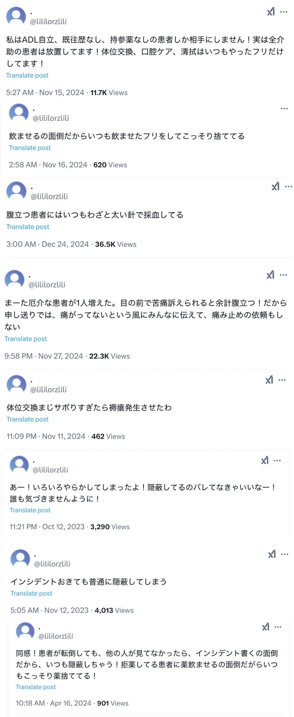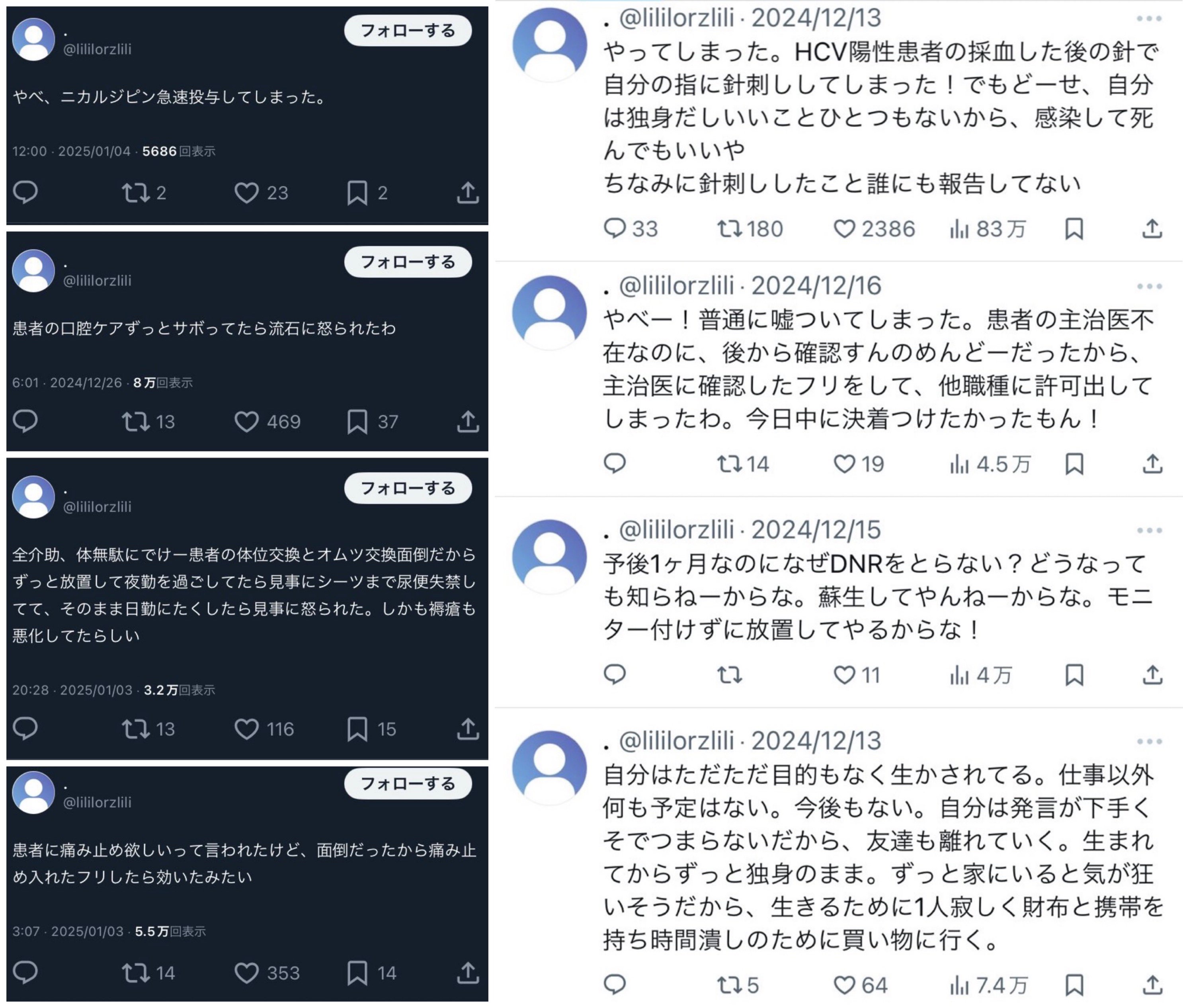 問題の投稿は2023年秋ごろから確認され、今年に入ってからは「やべ、ニカルジピン急速投与してしまった」「全介助、体無駄にでけー患者の体位交換とオムツ交換面倒だからずっと放置して夜勤を過ごしてたら見事にシーツまで尿便失禁して(中略)、褥瘡(じょくそう)も悪化してたらしい」といった投稿が相次いだ。閲覧者からの批判が続出し、7日現在アカウントは削除されている。