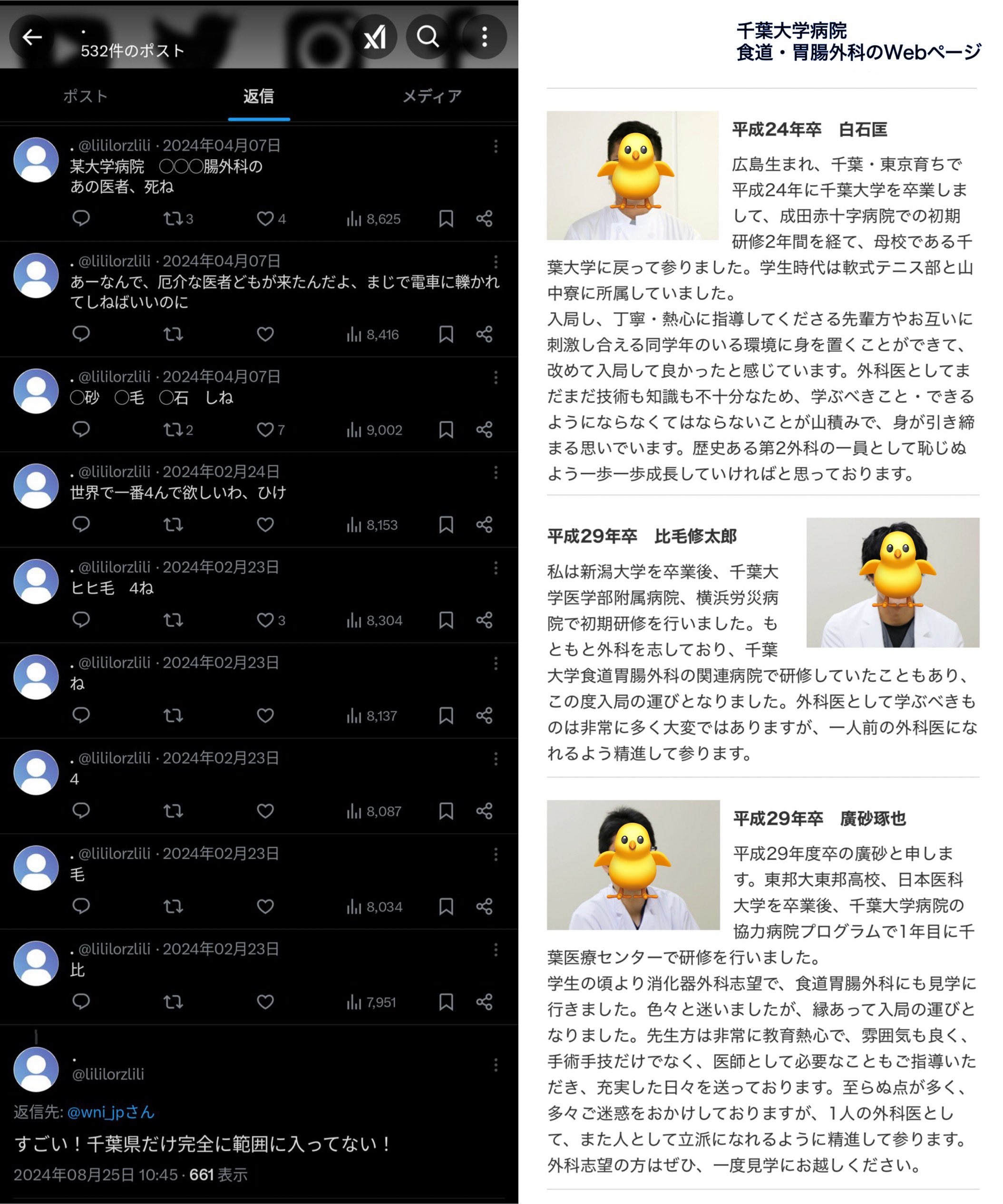 24年4月の投稿には「某大学病院、◯◯◯腸外科のあの医者、死ね」と医師の名前が伏せ字で記されていたことから、千葉大病院の食道・胃腸外科の医師のことではないかと推察する声が発生。同院には、問い合わせの電話が数件かかってきているという。