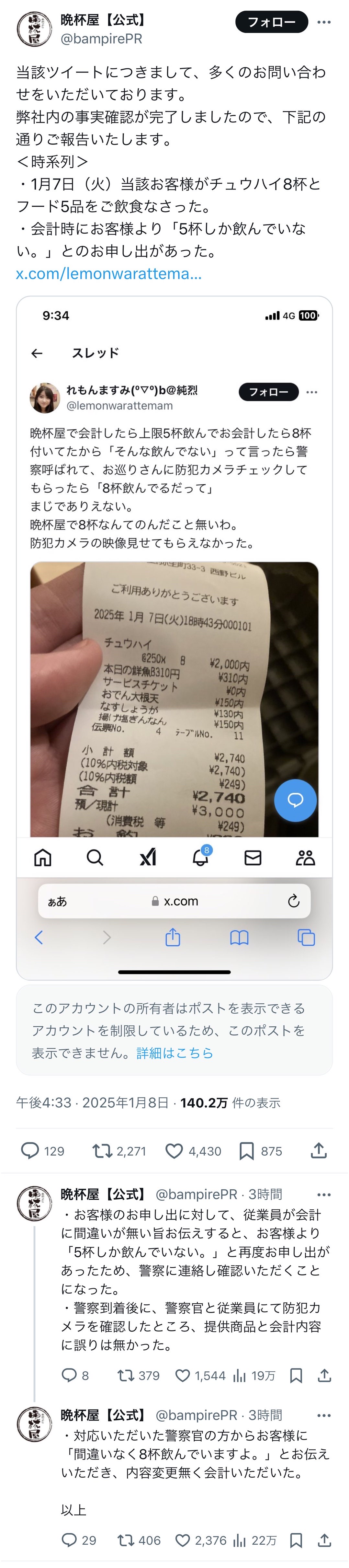 X民「居酒屋で5杯しか飲んでないのに8杯の値段取られた」→店「説明します」 Twitter Facebook はてブ LINE コピー 2025.01.09 スポンサーリンク ◇ 1: 名無し 2025/01/09(木) 11:56:32.63 ID:5QmCq3If0 ↓ https://x.com/bampirePR/status/1876895047288807719 ◇ 9: 名無し 2025/01/09(木) 11:59:02.61 ID:sJXbf55B0 平日昼から飲んでて草 ◇ 13: 名無し 2025/01/09(木) 11:59:17.73 ID:HSYIFt/60 酔って飲んだ数すら覚えてないとかやべー奴すぎる 続きを読む