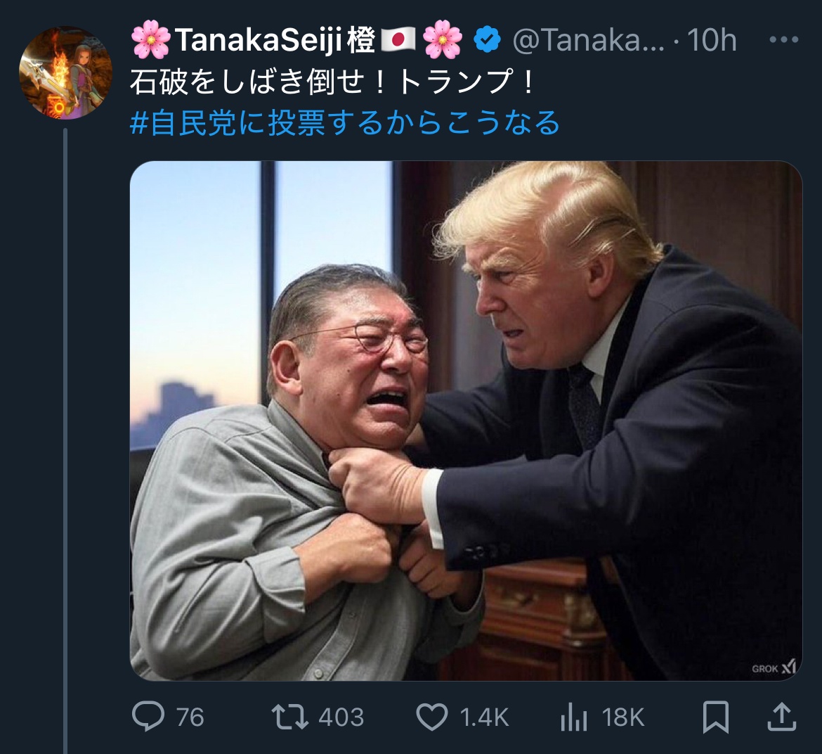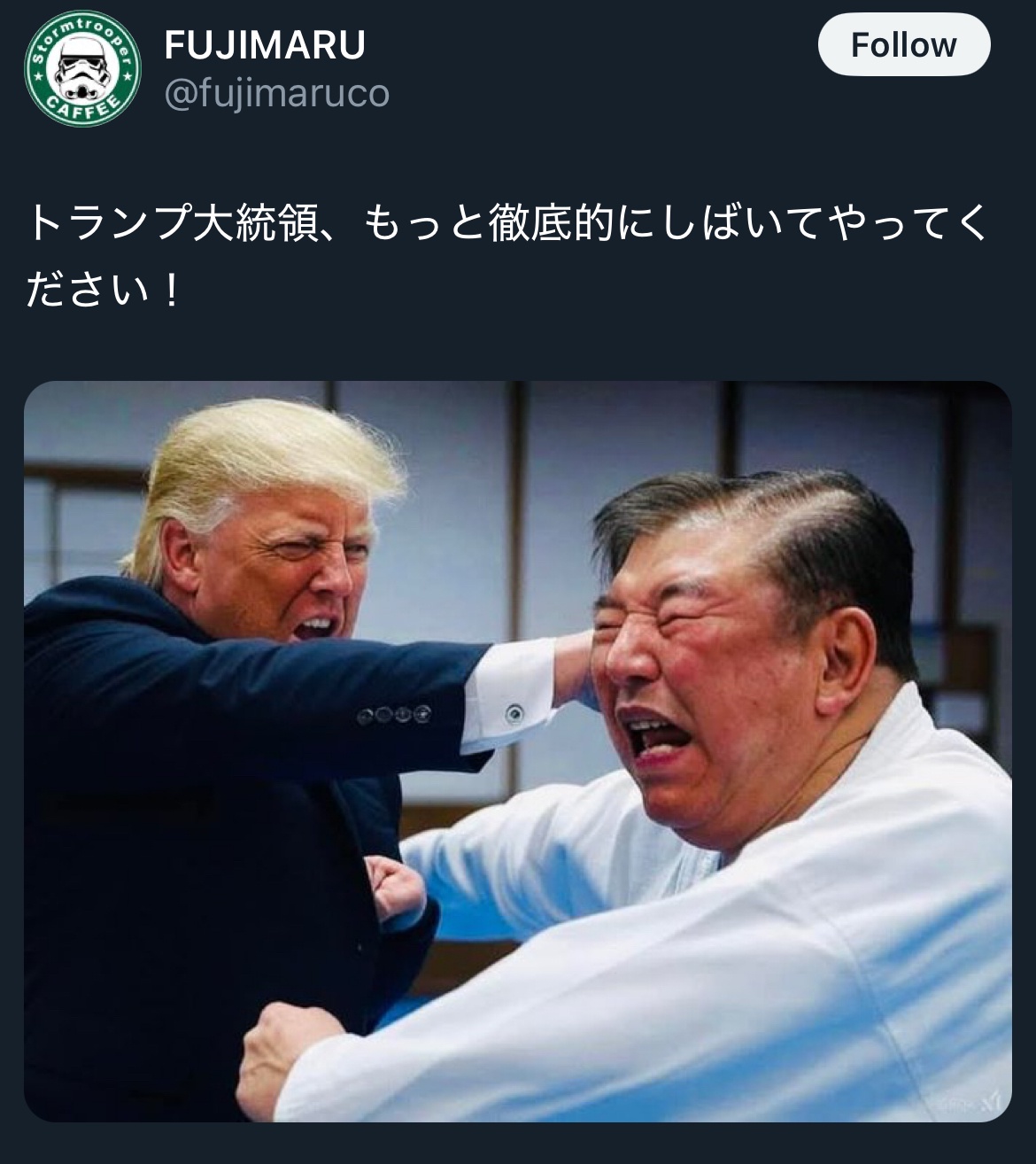 【画像】𝕏の反自民党界隈、トランプが石破をブン殴るAI画像を作るwwwwwwwwwwwwwwww Twitter Facebook はてブ LINE コピー 2025.01.14 スポンサーリンク 1:それでも動く名無し:2025/01/13(月) 19:44:05.10 ID:TucJY2jp0 大盛り上がりしてる模様 2:それでも動く名無し:2025/01/13(月) 19:44:20.45 ID:rO6q9Ny50 えぇ… 4:それでも動く名無し:2025/01/13(月) 19:44:45.60 ID:RL3KuXiw0 ぶすすぎやろ 続きを読む
