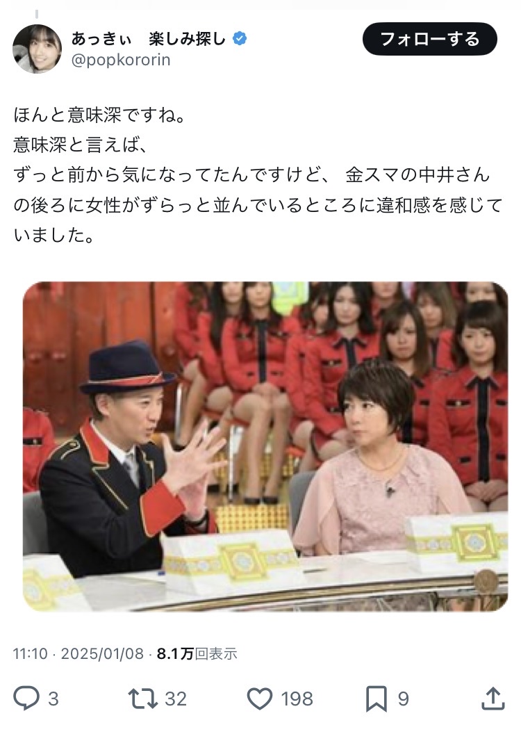 【闇深】中居の金スマ←大勢の女👩👩👩が背面にいた理由…😱 Twitter Facebook はてブ LINE コピー 2025.01.16 スポンサーリンク 1:それでも動く名無し:2025/01/16(木) 12:55:54.67 ID:fDB7LZ3x0 5:それでも動く名無し:2025/01/16(木) 12:59:12.74 ID:4FjZ1j//a コイツらは喜んで献上されるやろうから刺激がなくて飽きたんやろな 続きを読む
