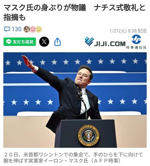 マスク氏の身ぶりが物議 ナチス式敬礼と指摘も