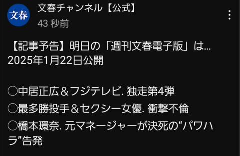 【文春砲】最多勝投手&セクシー女優 衝撃不倫 Twitter Facebook はてブ LINE コピー 2025.01.21 スポンサーリンク 1:それでも動く名無し:2025/01/21(火) 21:08:03.97 ID:4KJkNfpq0 3:それでも動く名無し:2025/01/21(火) 21:09:13.97 ID:LrrBKydF0 最多勝(30年前) 5:それでも動く名無し:2025/01/21(火) 21:09:45.36 ID:7IqfmId30 また西武じゃないだろうな 続きを読む