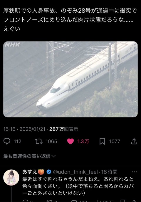 【画像】飛び込み自殺者さん、新幹線を破壊してしまうwwwwwwwwwwwwwwwwwwwwwwwww Twitter Facebook はてブ LINE コピー 2025.01.23 スポンサーリンク 1:以下、?ちゃんねるからVIPがお送りします:2025/01/22(水) 09:47:07.819 ID:fgdfXFfp0 賠償金やばそう 5:以下、?ちゃんねるからVIPがお送りします:2025/01/22(水) 09:49:18.223 ID:q0c98ufv0 まるで自分で体験したように語ってるヤツはなんなんw 6:以下、?ちゃんねるからVIPがお送りします:2025/01/22(水) 09:49:54.492 ID:fgdfXFfp0 >>5 新幹線なんだろ 28:以下、?ちゃんねるからVIPがお送りします:2025/01/22(水) 10:23:19.640 ID:yCf5V9ec0 >>5 新幹線あすえ 続きを読む