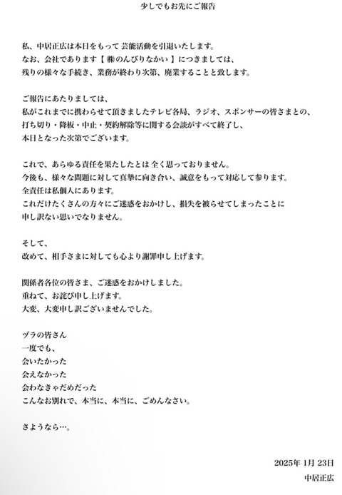 中居「ヅラの皆さん 会いたかった 会えなかった 会わなきゃだめだった ごめんなさい。さようなら…。」←これwwwwwwww Twitter Facebook はてブ LINE コピー 2025.01.23 スポンサーリンク 1:それでも動く名無し:2025/01/23(木) 18:13:18.73 ID:pC/Jo6bD0 2:それでも動く名無し:2025/01/23(木) 18:13:54.02 ID:M/GvzmXg0 akbかな 3:それでも動く名無し:2025/01/23(木) 18:13:56.95 ID:pC/Jo6bD0 感動のお別れ 4:それでも動く名無し:2025/01/23(木) 18:15:45.49 ID:ooFrzbhW0 引退とか誰にでもできる逃げだよな 続きを読む