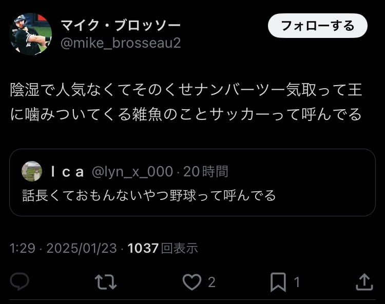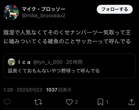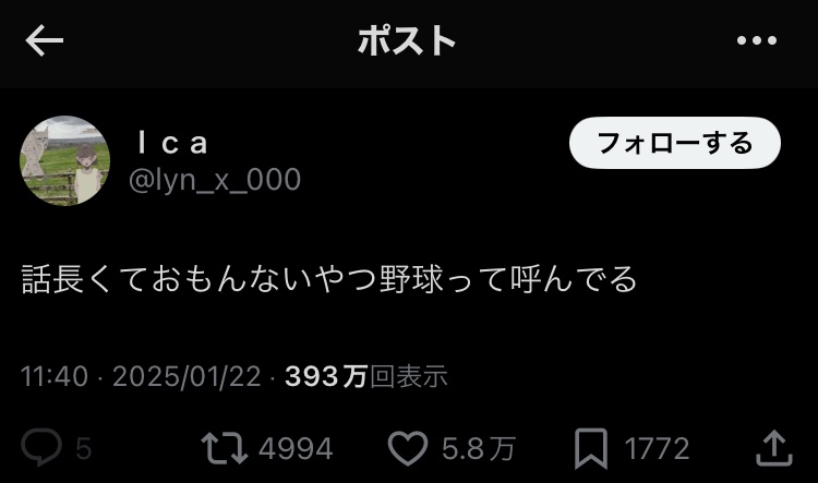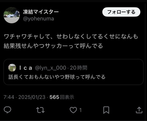 【画像】X民「話長くておもんないやつ野球って呼んでる」←5.4万いいねwwwwwwwwww Twitter Facebook はてブ LINE コピー 2025.01.25 スポンサーリンク 1:それでも動く名無し:2025/01/24(金) 09:15:52.00 ID:/Fcnrp/kM.net 反応 5:それでも動く名無し:2025/01/24(金) 09:20:02.58 ID:VxFVLwnf0.net 1枚目はなかなか上手いこと言ってるけどほかはただの売り言葉に買い言葉じゃん 続きを読む