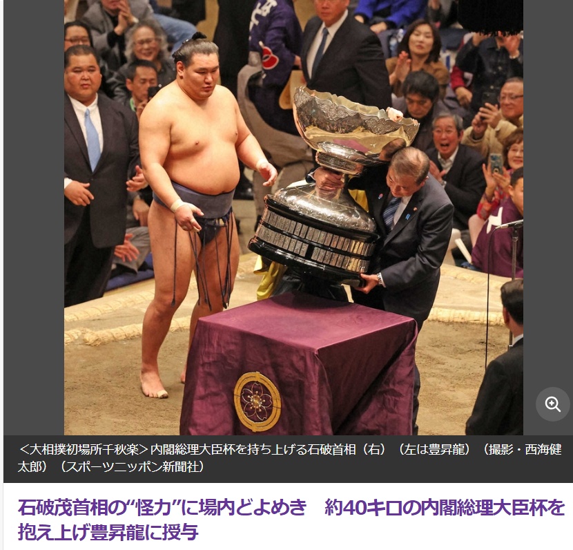 注目された土俵上の表彰式に石破茂首相(67)が登壇。はっきりとした口調で賞状を読み上げると、呼び出しが寄り添う中で重さ約40キロの内閣総理大臣杯を持ち上げ、豊昇龍に授与。