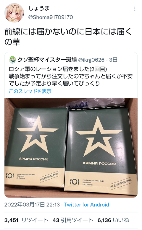 今までロシア軍の放出品だと思って世界中の通販サイトに出回っていたロシア軍MRE(戦闘糧食)が実は軍の在庫の横流し品で、書類上存在していたはずの在庫が全然なくて現場の補給部隊が慌ててる説あるのか…。