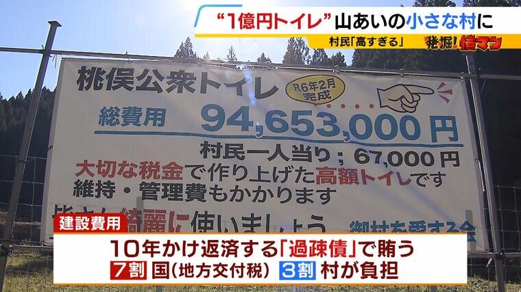 道路を挟んで隣にはくみ取り式の古いトイレがありましたが、村は新たに作ることにしました。費用は10年かけて返済する「過疎債」で賄い、その7割は国からの地方交付税で補い、3割は村が負担します。一部の住民は「高すぎる」と抗議を続けています。
