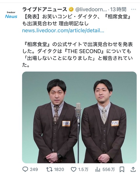 【悲報】ダイタク、マジでヤバそうwwwwwwwwww Twitter Facebook はてブ LINE コピー 2025.02.05 スポンサーリンク 1:それでも動く名無し:2025/02/05(水) 04:23:02.16 ID:TJQDS2fc0 アカン.... 2:それでも動く名無し:2025/02/05(水) 04:24:32.93 ID:OBlDFQnp0 フジテレビとテレ朝からTVに出しちゃいけない人に認定されたのか 3:それでも動く名無し:2025/02/05(水) 04:25:03.37 ID:pehDlBtS0 ギャンブル好きで後輩の面倒見が良い昭和気質の芸人なんやっけ? 続きを読む