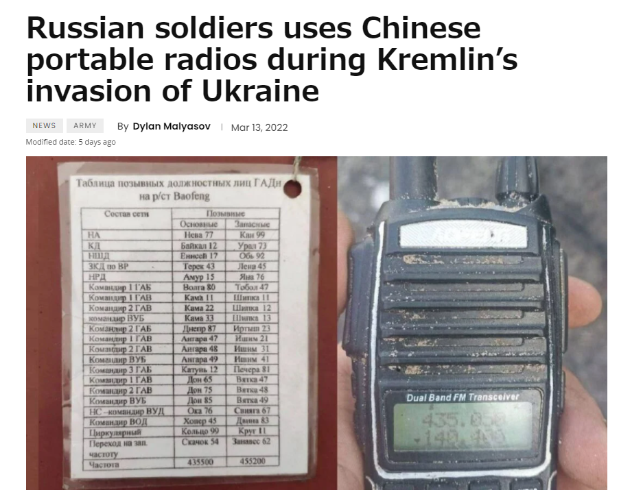 今月中旬Defense Expressは、当時最前線にいたロシア軍の部隊はBaoFengUV-82HPという無線機を使用していることがわかったと報じています。