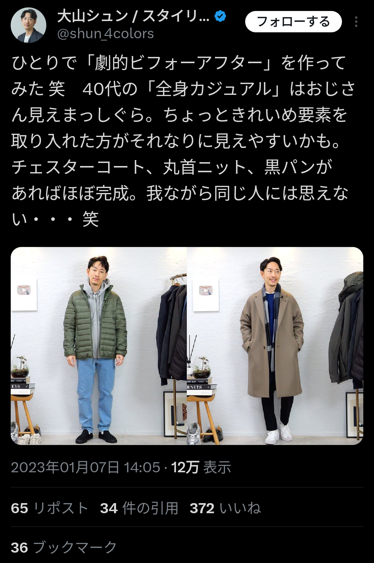 【画像】スタイリスト「40代がフードパーカーにダウン、ジーンズを着ると、おじ見えまっしぐら」 Twitter Facebook はてブ LINE コピー 2025.02.17 スポンサーリンク 1:それでも動く名無し:2025/02/16(日) 22:04:34.24 ID:1h+eMeWE0.net 気をつけよう 2:それでも動く名無し:2025/02/16(日) 22:06:07.82 ID:P4AkJUZOM.net ファッションもダイエットもやがこの手の画像ってなんで同じポーズ同じ表情で比較せんのや 3:それでも動く名無し:2025/02/16(日) 22:07:58.57 ID:Qp4uR9IO0.net どっちもあやしいおっさんにしか見えんが 続きを読む
