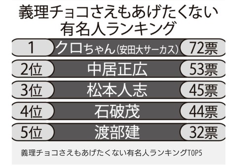 「義理チョコすらあげたくない」有名人ランキング、中居を抑えた1位はプロポーズ失敗の嫌われ芸人