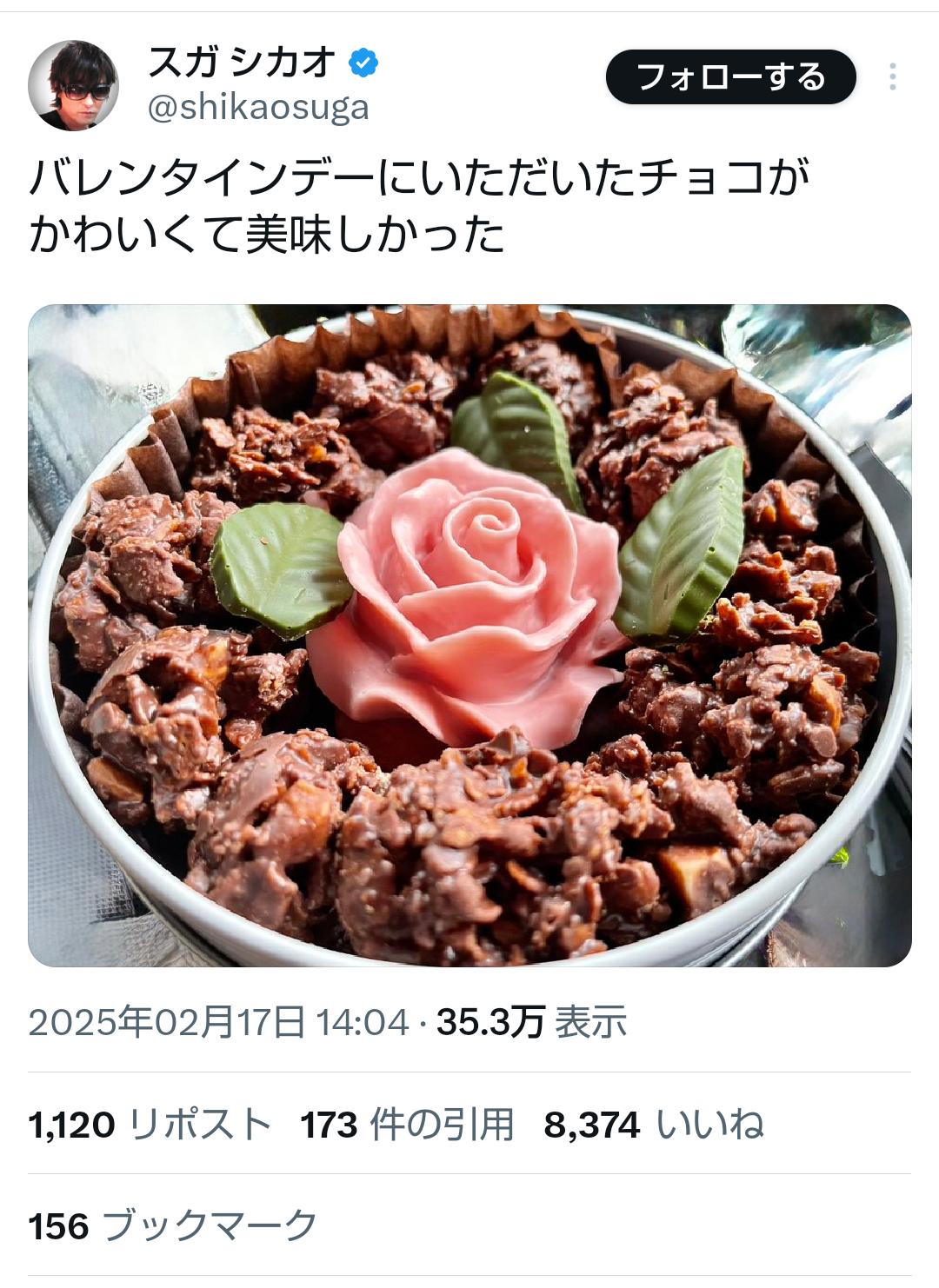 歌手のスガシカオさんが、バレンタインデーにもらったチョコをXに投稿したところ、「あるもの」にしか見えないと話題になっています。