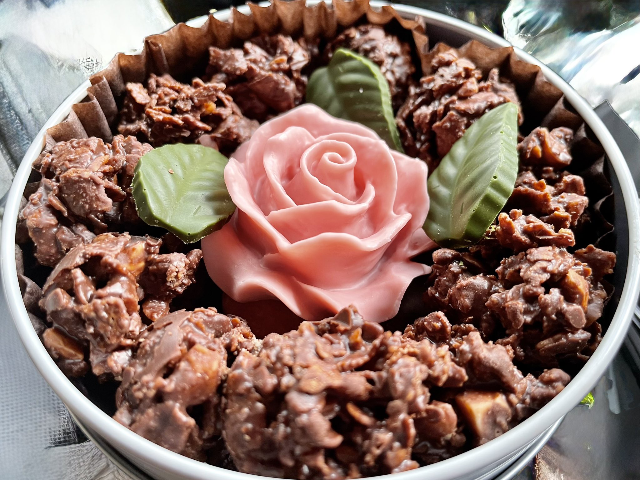 「バレンタインデーにいただいたチョコがかわいくて美味しかった」というコメントとともに、真ん中にピンクのバラのチョコが入った、チョコクランチの画像がアップされています。