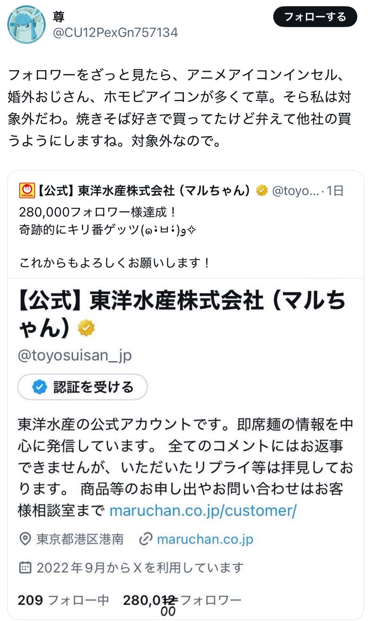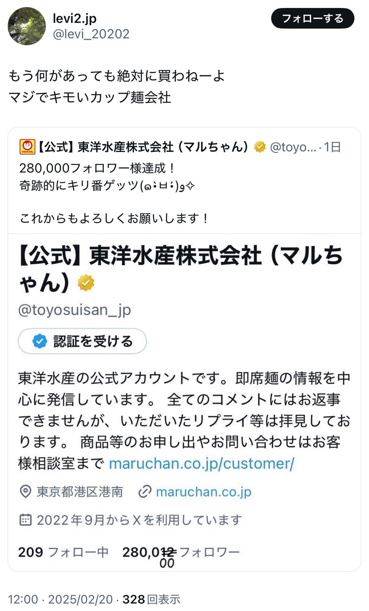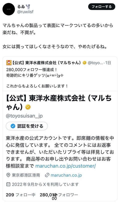 【悲報】マルちゃん正麺不買運動勃発wwwwwwwwwwwwwwwwwwwwwwwwwwwwwwwwwwwwwwwwwwwwwwwwwwwwww Twitter Facebook はてブ LINE コピー 2025.02.21 スポンサーリンク 1:それでも動く名無し:2025/02/20(木) 15:42:57.25 ID:Hi1v7m5y0 3:それでも動く名無し:2025/02/20(木) 15:45:28.12 ID:n8PoQqtL0 弱男の味方だから痛くも痒くもない 6:それでも動く名無し:2025/02/20(木) 15:47:12.68 ID:1TGQGFHd0 普段買わん人らでしょ 続きを読む