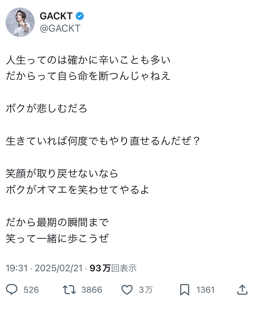 GACKT、死んでんじゃねーぞクソガキみたいなことを言うwwwwwwwww Twitter Facebook はてブ LINE コピー 2025.02.22 スポンサーリンク 1:それでも動く名無し:2025/02/22(土) 00:24:21.99 ID:fcpx0YZwd 2:それでも動く名無し:2025/02/22(土) 00:26:09.68 ID:arb2E1Ic0 急にどうしたんや 3:それでも動く名無し:2025/02/22(土) 00:27:31.23 ID:xS05bfb/0 流石にこんなキャラちゃうやろ偽物や 4:それでも動く名無し:2025/02/22(土) 00:28:27.48 ID:wr9qzGim0 映す価値なし 続きを読む
