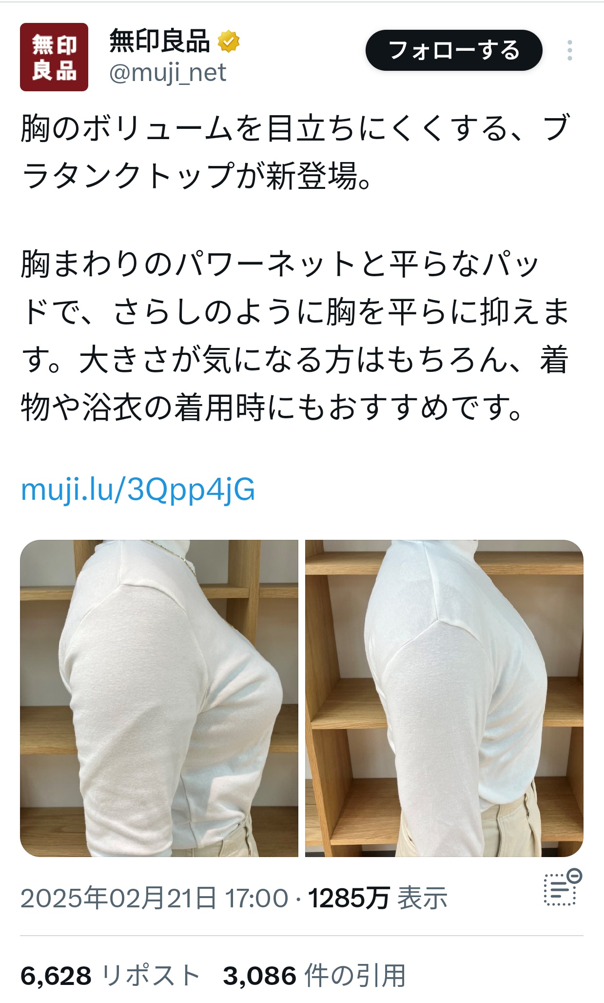 【画像】無印良品「お胸を抑えて目立たなくするブラ作ったよ!」 Twitter Facebook はてブ LINE コピー 2025.02.24 スポンサーリンク 1:以下、?ちゃんねるからVIPがお送りします:2025/02/23(日) 23:30:57.182 お前らどうすんのこれ 3:以下、?ちゃんねるからVIPがお送りします:2025/02/23(日) 23:31:44.230 これは欲しい 続きを読む