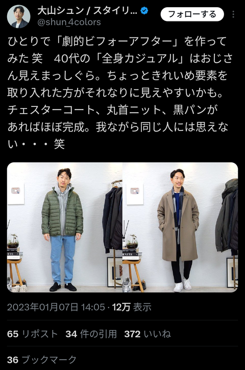 【画像】スタイリスト「40代でフードパーカーにダウン、ジーンズを着るのはダサいです」 Twitter Facebook はてブ LINE コピー 2025.02.24 スポンサーリンク 1:それでも動く名無し:2025/02/24(月) 01:57:42.76 ID:eIHGfz5D0 気をつけよう 2:それでも動く名無し:2025/02/24(月) 01:59:25.66 ID:hzw9c8dn0 むしろパーカーが流行ったのがこの世代のキッズ時代だから10代20代が着てるのは違和感しかないわ 4:それでも動く名無し:2025/02/24(月) 02:02:23.35 ID:zOvm5nzv0 明るめの青パンツで浮かせてるだけやん 続きを読む