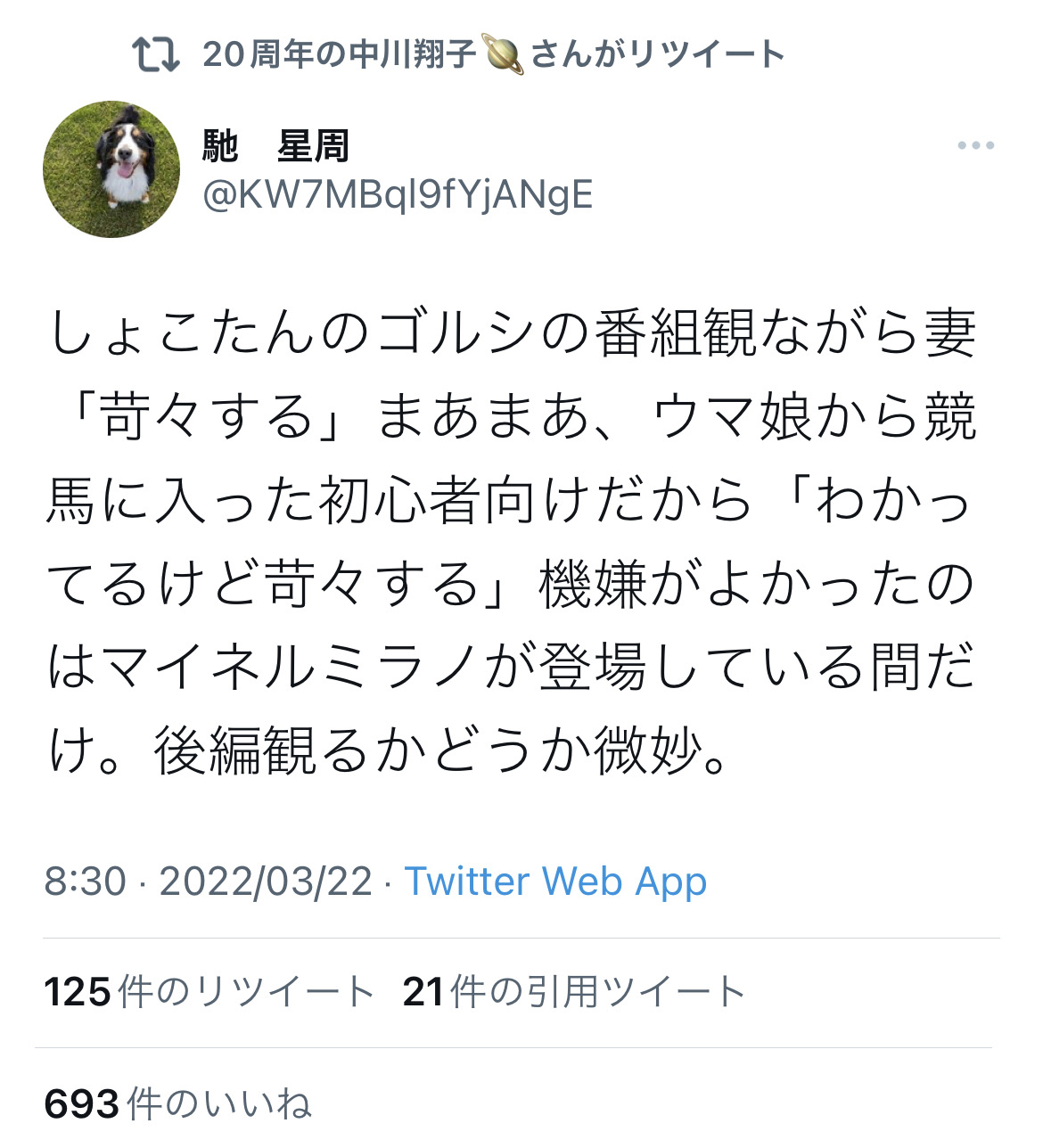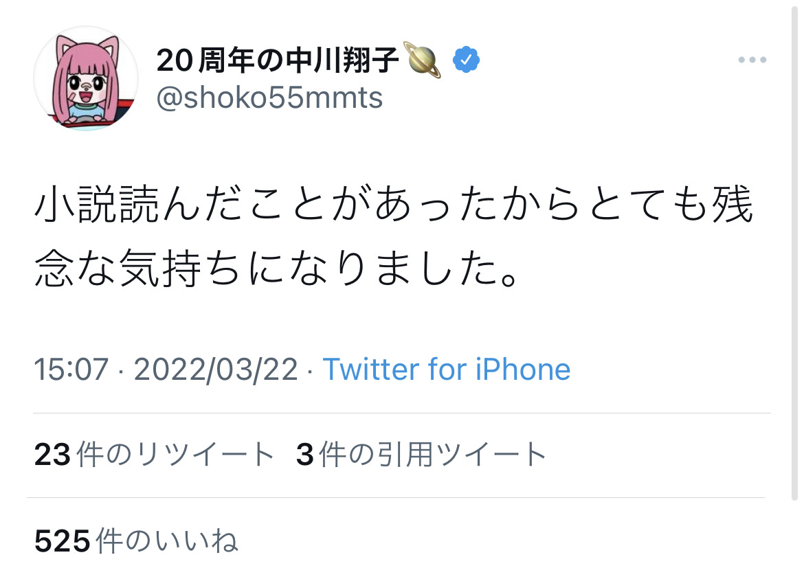 有名小説家「妻がしょこたんの競馬番組見てイライラしてる」中川翔子さん、悲しんでしまう Twitter Facebook はてブ LINE コピー 2022.03.22 スポンサーリンク 1: それでも動く名無し 2022/03/22(火) 15:45:04.49 ID:7QNmK1SPa https://twitter.com/KW7MBql9fYjANgE/status/1506050693635145729 20: それでも動く名無し 2022/03/22(火) 15:51:37.83 ID:uZdp05810 RTして晒してるのか 21: それでも動く名無し 2022/03/22(火) 15:51:44.19 ID:vR0S6iLoa ほんまに小説読んだことあんのかも怪しい 続きを読む