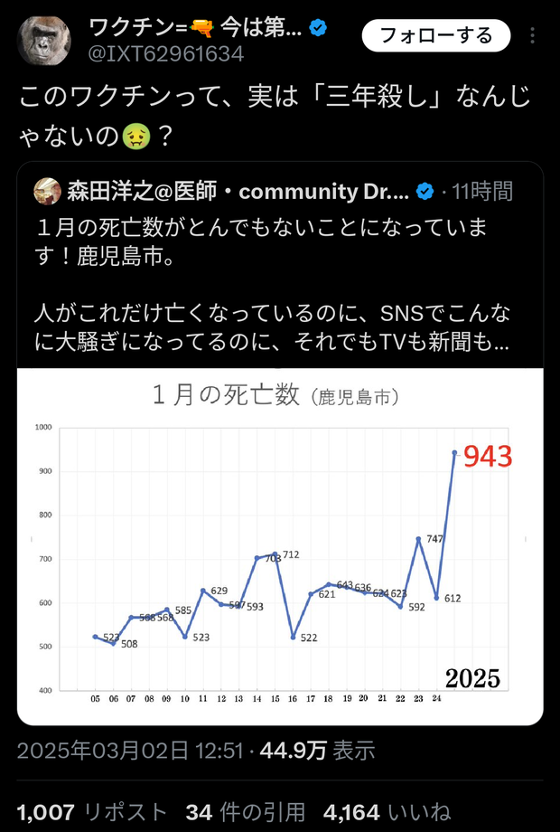 【衝撃】コロナワクチン、「三年殺し」だった Twitter Facebook はてブ LINE コピー 2025.03.03 スポンサーリンク 1 : 以下、?ちゃんねるからVIPがお送りします :2025/03/02(日) 20:57:01 ID:eUxYps5t0.netこのワクチンって、実は「三年殺し」なんじゃないの🤢? https://t.co/g36PBc4tv6— ワクチン=🔫 今は第三次世界大戦中🚨 (@IXT62961634) March 2, 2025転載元スレッド:https://viper.2ch.sc/test/read.cgi/news4vip/1740916621/ 続きを読む