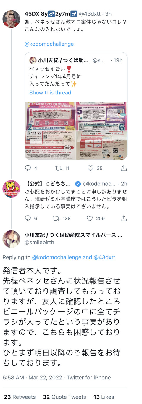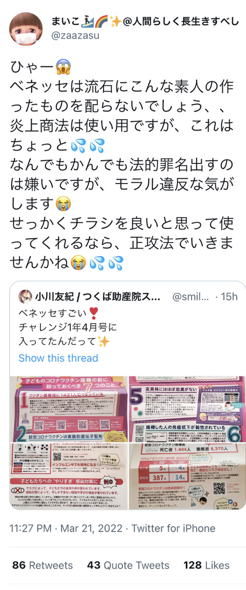 助産院院長「子どもチャレンジに反ワクチンのチラシ入ってた!」→しまじろうが謝罪しまくるwwwwwwwww Twitter Facebook はてブ LINE コピー 2022.03.23 スポンサーリンク 1::2022/03/22(火) 21:13:48.05 ID:sXM4Dchx0 BE:633829778-2BP(2000) 2::2022/03/22(火) 21:15:06.67 ID:HjarvR+40.net ↓反ワクが一言 3::2022/03/22(火) 21:15:43.99 ID:LIaBuVhL0.net なにがどうなってこんなことに 4::2022/03/22(火) 21:16:06.95 ID:paa66GAk0.net らむりんの逆襲 続きを読む