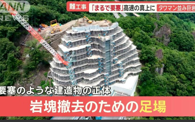 群馬県にある上信越道では、高さ70メートルもの大きな足場が組まれていて、落石の恐れがある岩を撤去する作業が行われています。高速道路を止めないで巨大な岩の塊を取り除くという、世界初の工事です。