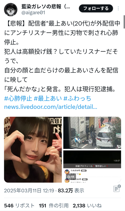 高田馬場で配信者の女性が殺害された事件 高額スパチャ後ブロックされたことが動機だとの情報 Twitter Facebook はてブ LINE コピー 2025.03.11 スポンサーリンク 57:それでも動く名無し:2025/03/11(火) 13:07:40.90 ID:SDYQnaRP0 マジで動機なにこれ? 69:それでも動く名無し:2025/03/11(火) 13:10:43.50 ID:ownXWS5x0 >>57 搾取相手をブロックしたからこうなった 続きを読む
