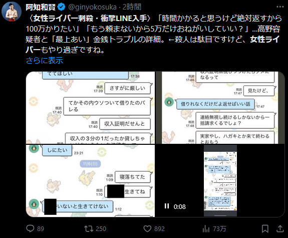 続きを読む〈女性ライバー刺殺・衝撃LINE入手〉「時間かかると思うけど絶対返すから100万かりたい」「もう頼まないから5万だけおねがいしていい?」…高野容疑者と「最上あい」金銭トラブルの詳細。←殺人は駄目ですけど、女性ライバーもやり過ぎですね。 pic.twitter.com/G6OZKD3OfW