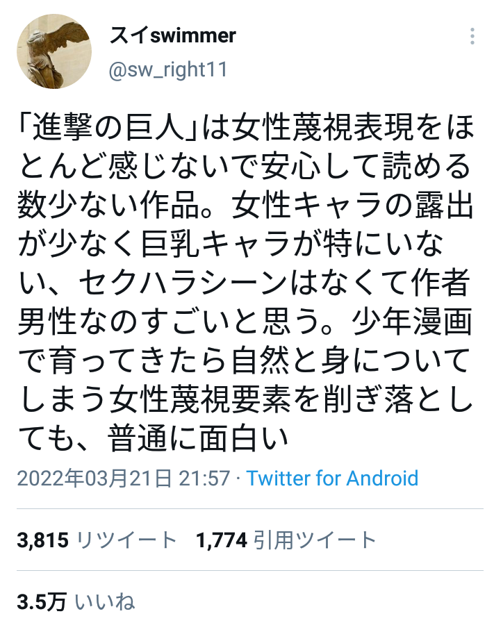 【朗報】フェミニストさん「進撃の巨人は巨乳と女性蔑視がなくて安心できる作品」